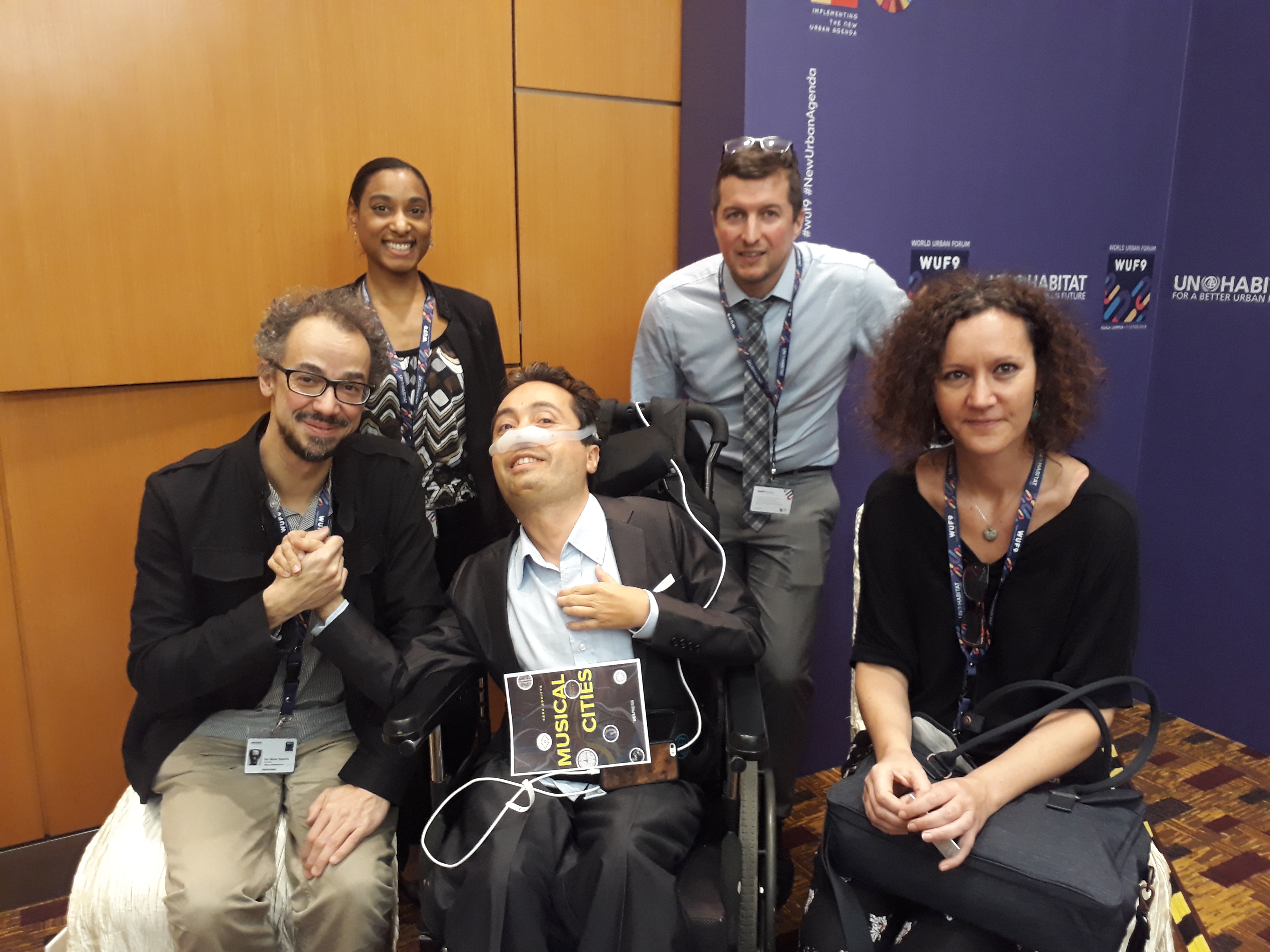 From bottom up and right to left: Erika Trabucco, HI Accessibility Technical Advisor, Dr. Victor Pineda, co-chair of the DIAUD, Eric Remacle, HI Road Safety Technical Advisor, Benjamin Dard, CBM, Aurélie Beaujolais, HI Info&Publication Advocacy Manager.[/caption]The Forum was attended by a delegation from Humanity & Inclusion (HI), to ensure follow up of streams of work regarding road safety and accessibility.“It is important for road safety NGOs to be a part of the vision for sustainable cities and to find synergy with people and organizations coming from other perspectives,” says Eric Remacle, HI technical Advisor on Road Safety. “We must have a perspective that thinks of road safety not just in terms of reducing road deaths but as part of a systemic approach to sustainable cities.”Eric points to three of the themes of WUF9 that have particular relevance to the road safety agenda—urban planning, accessibility, and gender: “The cities of tomorrow should be inclusive and safe for all. We need to try to think about how to make our cities inclusive in terms of road safety and accessibility.”Read full interview on the website of the Global Alliance of NGOs for Road safety here.