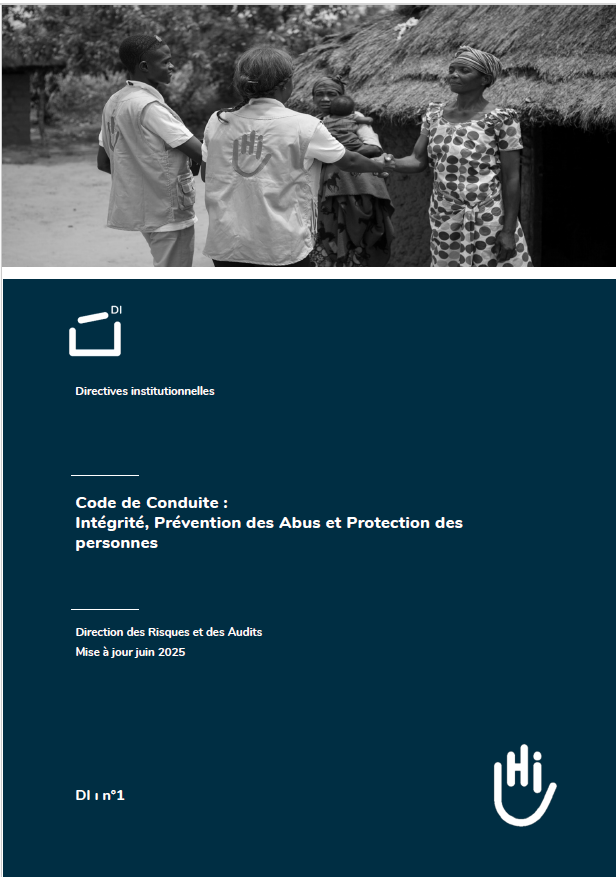 Les politiques "genre", "protection des bénéficiaires" et "protection de l'enfance" sont complétées par un Code de conduite qui s’applique à toute personne susceptible de représenter HI (salariés, administrateurs, proches accompagnant le personnel expatrié, consultants, prestataires et organisations partenaires, stagiaires, bénévoles). Il s’applique pendant et en dehors des heures de travail.